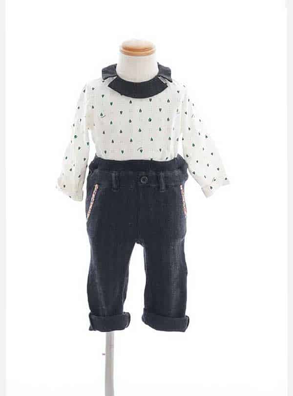 小さな家がドット柄のように描かれたトップスに、目を引く特徴的な紺色の襟がアクセントとなった1着!赤ちゃんらしいカジュアルなスタイルで可愛らしさをも演出し、落ち着いた色味のパンツは大胆なコントラストを生み出し、小さな冒険心をもくすぐるデザインとなっています! カジュアルなコーディネートなので私服の家族撮影にも似合う!