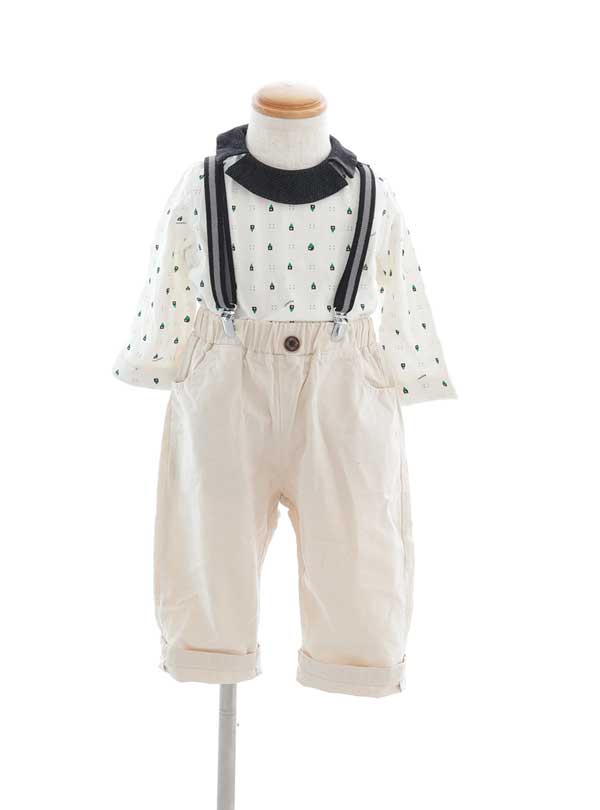 カジュアルスタイルで、赤ちゃんらしさと可愛らしさを兼ね備えた衣装。小さな家柄がドットのように描かれたトップスで遊び心をプラスし、シンプルながらも個性光るデザインが魅力的です。 特徴的な紺色の襟やサスペンダーで全体の色味を引き締めています。ベージュカラーで統一されているので優しい印象にもなります。