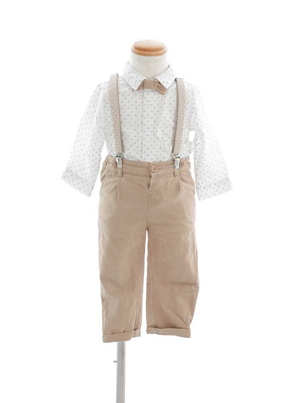 三角のドット柄のシャツにベージュのパンツ、ベージュのサスペンダー、ベージュの蝶ネクタイと色味が統一されておりシンプルでオシャレな1着。サスペンダーがさらに可愛さを引き立て、カジュアルな撮影にもピッタリ♪ 控えめながらも上品で、ナチュラルな魅力を引き出すこの1着で、写真映えもバッチリな特別な日を演出してみてください。