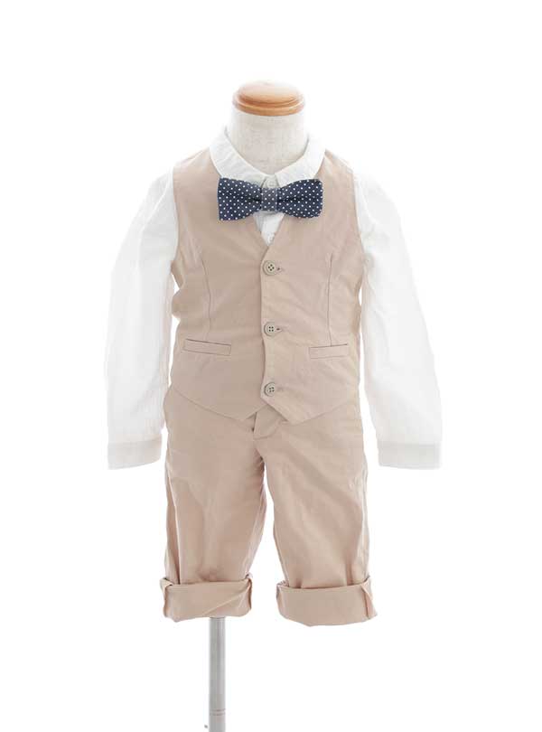 フォーマルでスタイリッシュな紳士風セットアップ。ベージュベストとパンツがシックな印象を与え、洗練された大人顔負けのコーディネートを楽しめます! ポイントはネイビーの水玉リボンの蝶ネクタイで、ちょっぴり遊び心もプラスしております。特別な日の写真撮影にも最適でどんな場面でも主役級の存在感を引き出します。