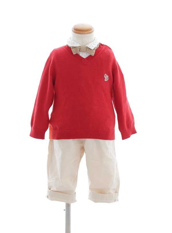 元気いっぱいの小さなオシャレさんにピッタリな1着。鮮やかな赤いセーターがぱっと目を引き、可愛らしさと活発さを同時に演出します。下の白いシャツの襟がさりげなくフェミニンなアクセント! アイボリーのパンツが全体を優しいトーンでまとめ、バランスも抜群。カジュアルなのにしっかりとセンスが光る1着となっております。