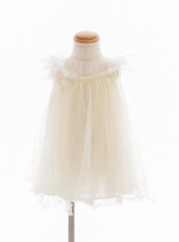 シンプルで上品なデザインのフリルワンピース。柔らかいクリームカラーが特徴で、ショルダー部分にはふんわりとしたチュールフリルが施されており、全体的に軽やかで可愛らしい印象を与えてくれます。 軽やかな素材感と、全体に施された柔らかいチュールがふんわりとした女の子らしいシルエットを作り出します。どんなスタジオ背景でも良く合う1着です。