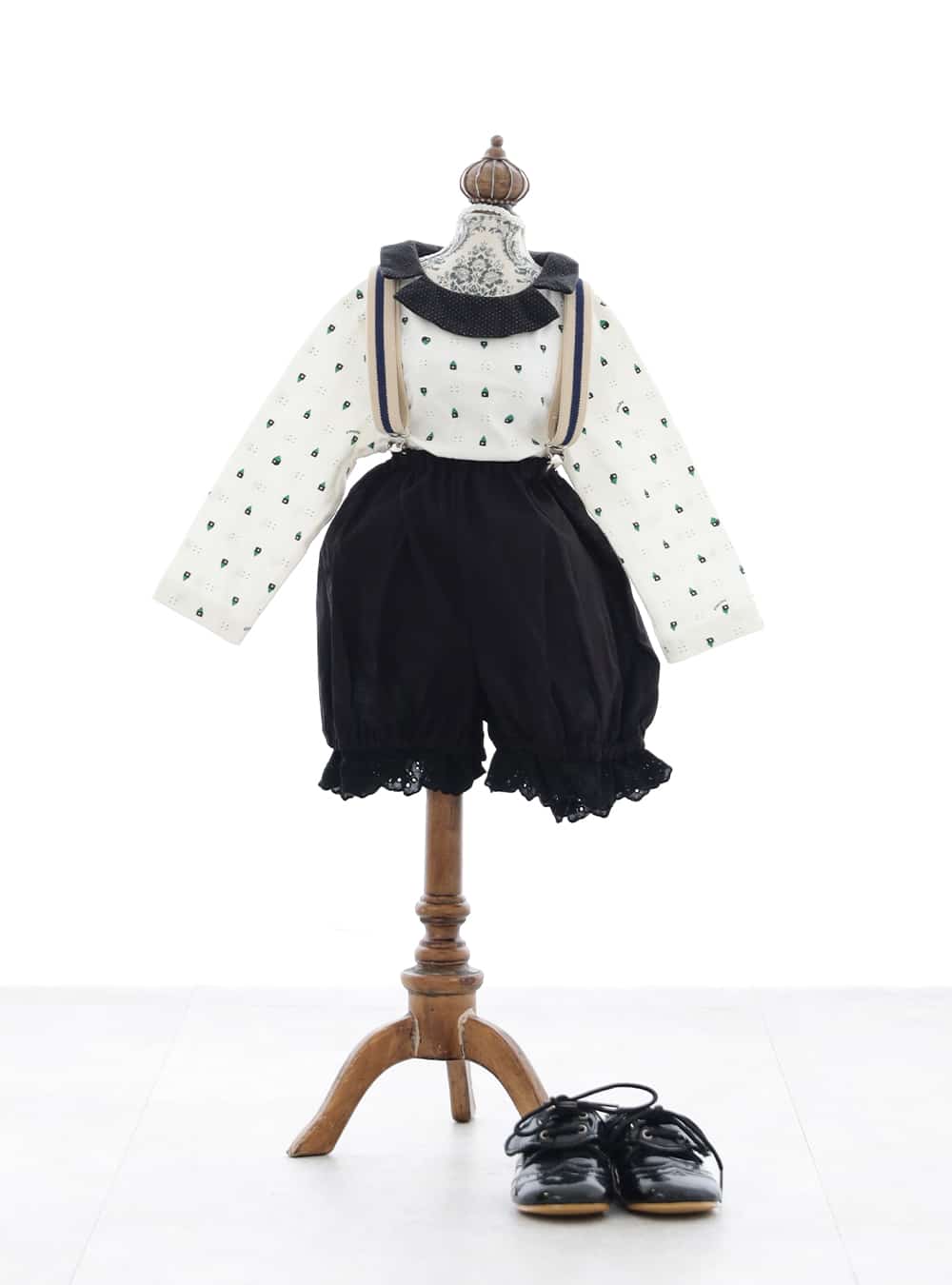柄のあるトップスにふんわりとしたバルーンパンツ合わせが可愛らしいコーディネート。 可愛らしい襟のデザインにボトムスのレースが相性良く、男女どちらでも着用していただけます。ストライプ模様のサスペンダーが衣装全体を引き締め、コーディネートにまとまりを与えてくれ、カジュアルながらもフォーマルな印象に仕上げてくれる1着です。