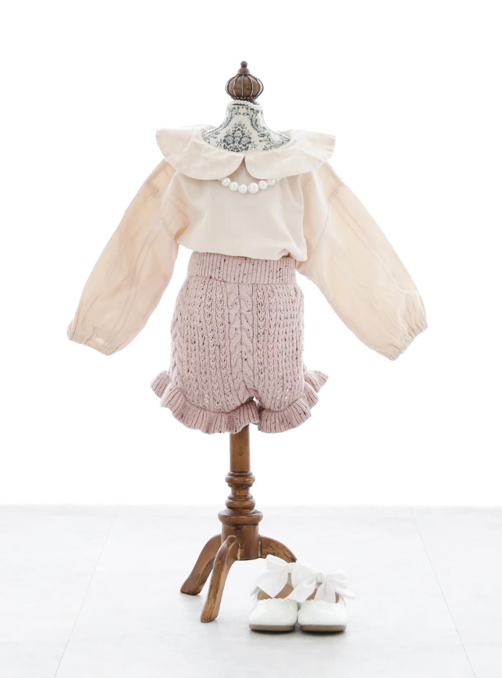 柔らかな印象のくすみピンクのニットパンツとベージュのブラウスが織りなす、優しい色合いが魅力的で上品なコーディネート。 ケーブル編みのニットパンツとブラウスは落ち着いた印象を与えつつ、フリルで可愛らしさもプラス。細かなディテールへのこだわりが、ガーリーな雰囲気を演出しています。