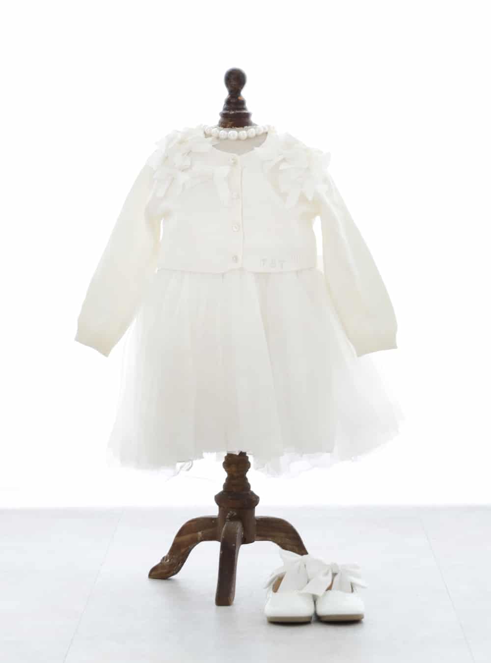 上品で可愛らしいフォーマルな1着。真っ白なワンピースとカーディガンが相性良く清潔感のあふれる印象です。ワンピースの上半身にはレースがあしらわれており、華やかさをプラスしています。 カーディガンには肩や胸元にリボンがついており、女の子らしさ満点のデザインです。大振りのパールネックレスなどとも合わせやすくより魅力的に仕上げてくれます。
