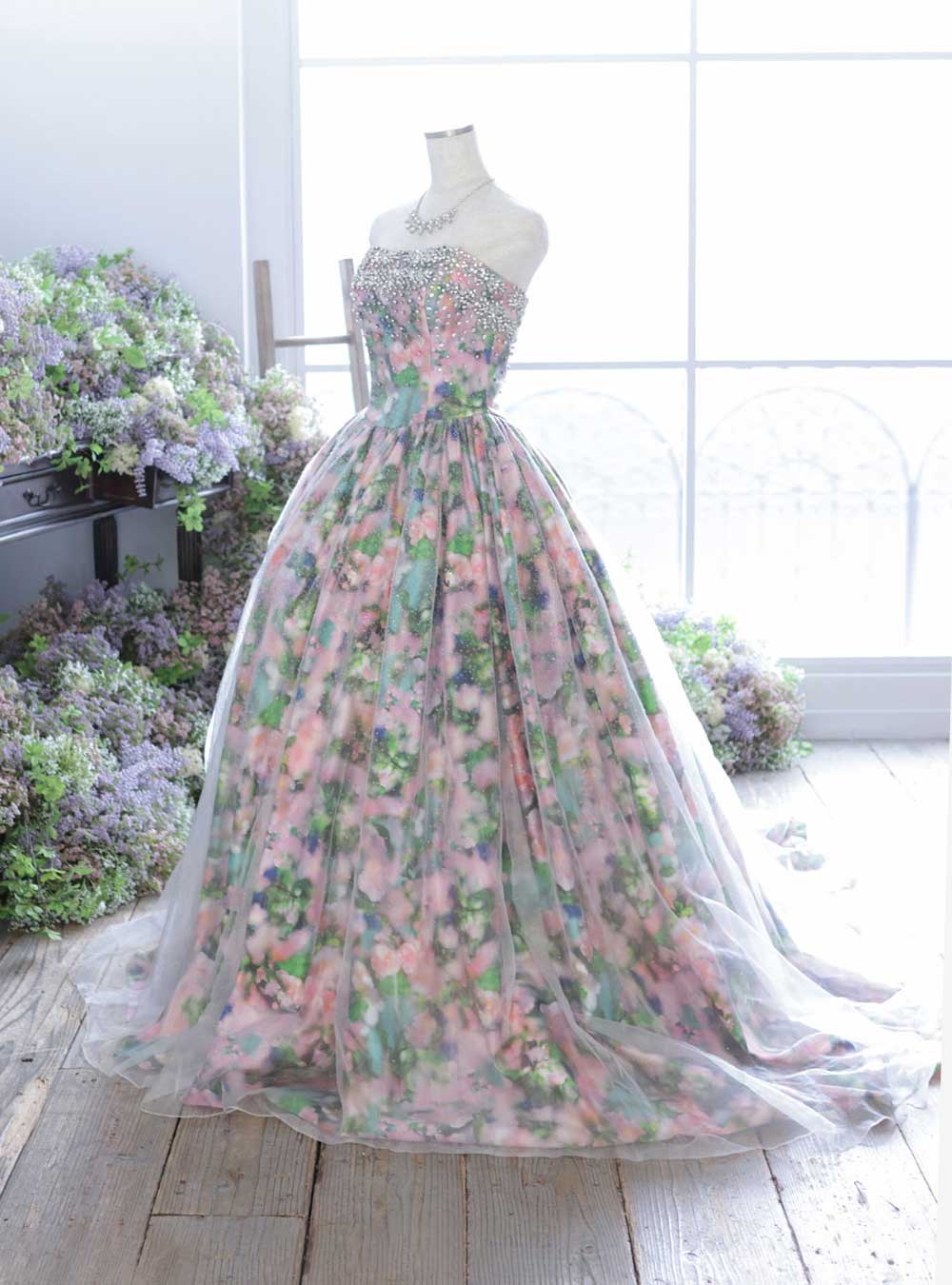 ピンクと緑が絶妙なバランスで蜷川実花デザインの中でもナチュラルカラーなドレス。 まるでお花畑にいるかのような、素敵な花柄にキラキラのグリッターチュールを重ね合わせたカラードレスで、胸元のラインストーンも写真映えするポイントです。 2サイズフリーで9号~11号までの対応です。