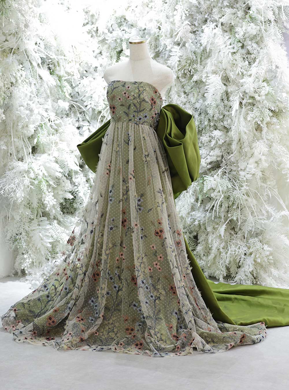 こちらのMARIAROSAのドレスは、繊細な花柄の刺繍が施されたチュール生地と鮮やかなグリーンのボリュームスリーブが特徴で、腕を抜くとバックリボンにもなるので、2way使用可能となっています。またエレガントでありながらモダンなデザインとなっています。豪華なトレーンがドラマチックな効果を生み出し、優雅さを感じさせ、伝統と現代の要素を見事に融合させた一着です。