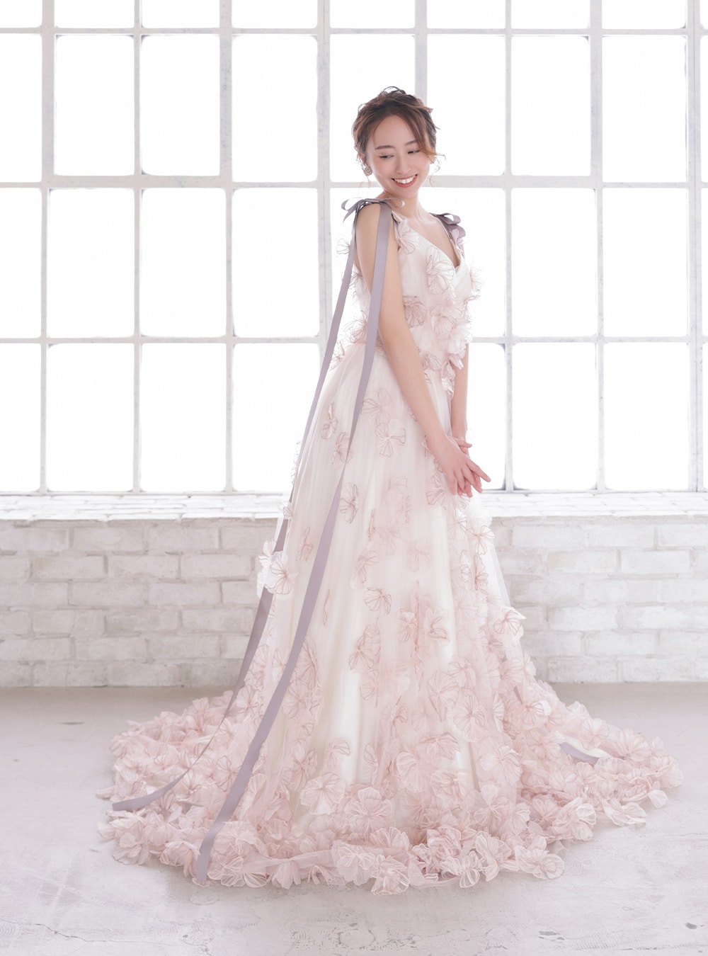 淡いピンクの花が全体にあしらわれた可憐な印象の一着です。優しい色合いと立体感のある花びらは透明感があり上品で華やかな印象を与えます。また裾に向かってボリュームを増していき、動きに合わせて優美に揺らめきます。シックな肩のリボンが可愛らしいアクセントとなり可憐さを纏い、ロマンティック雰囲気を演出します。