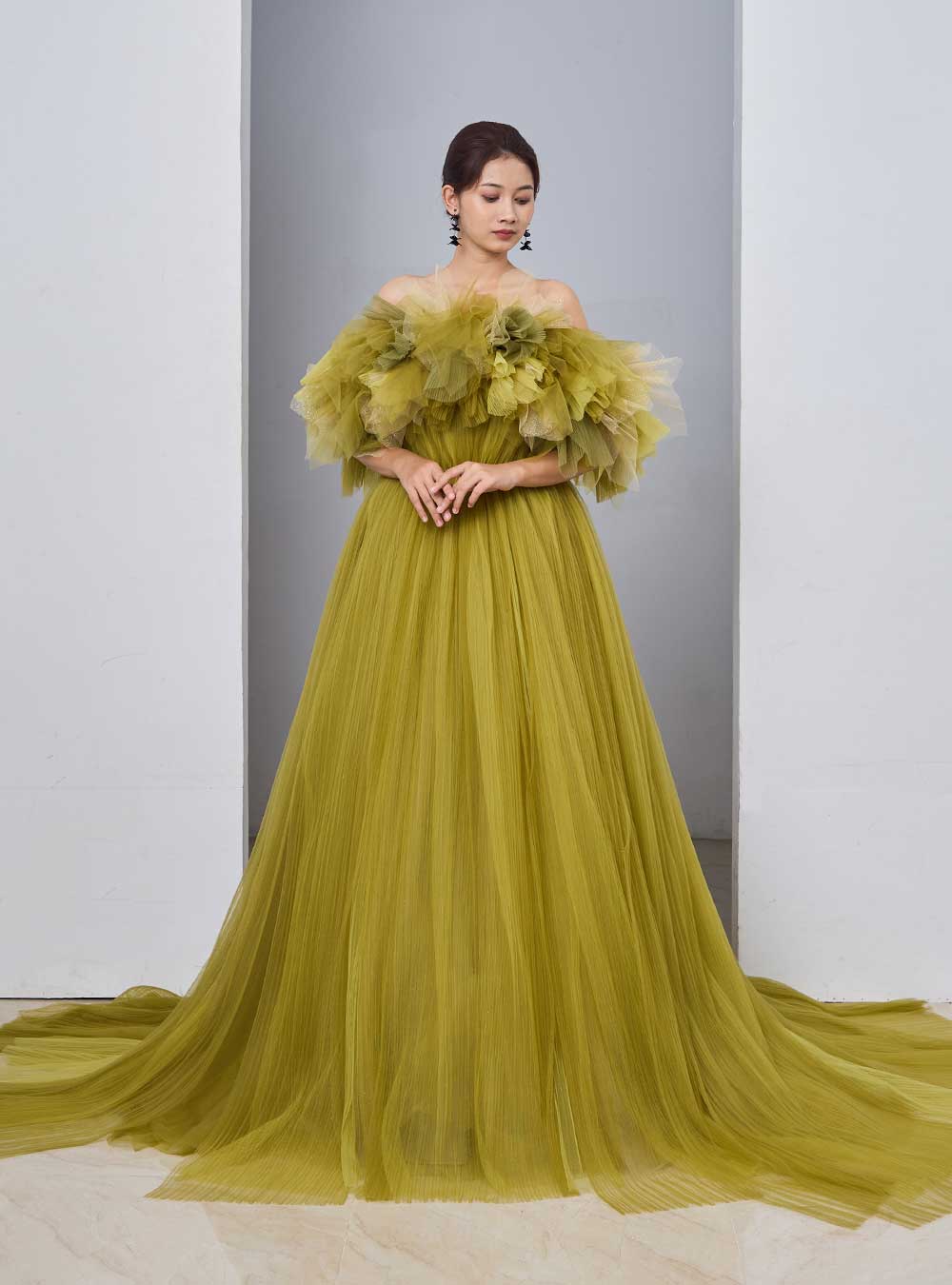 爽やかでロマンティックな一着です。歩くたびに揺れるチュールが軽やかで華やかな印象を与えます。落ち着いた色味ながらもシルエットが特徴的で上品で洗練された雰囲気です。胸元を飾るボリュームのあるフリルはオフショルスタイル、斜めにかけてワンショルダースタイル、取り外してビスチェスタイルの3wayタイプで自分に合った好きなスタイルを選べるのも魅力的です。