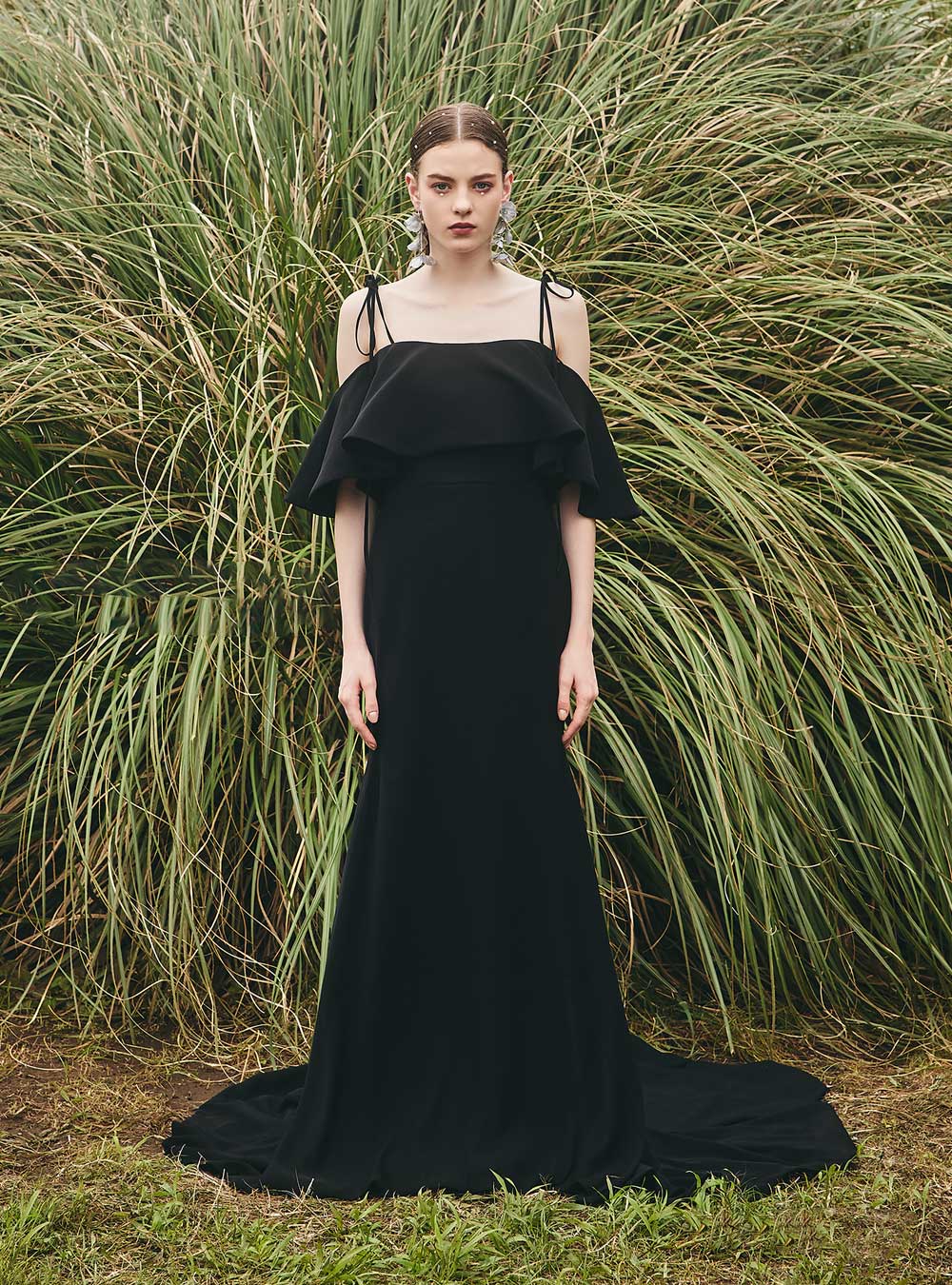 大人の魅力を最大限に引き出す一着です。装飾の無いシンプルなデザインが黒本来の美しさを際立たせ、洗練された雰囲気を演出します。フェミニンなフリルとキャミソールスタイル、華やかなボリュームのあるパフスリーブのオフショルスタイル、シンプルながらも気品漂うビスチェスタイルの3wayで個性が出せるのも魅力的です。落ち着いた色彩はどんなシーンにも上品に溶け込み、優雅に広がる裾は周りの視線を惹きつけ、ロマンティックな印象を与えます。