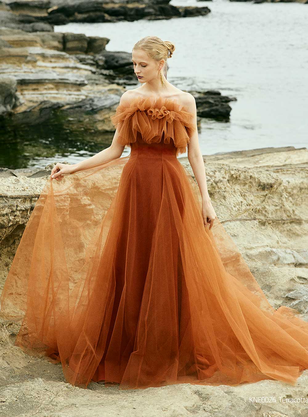 胸元を飾るボリュームのあるチュールのフリルが印象的な一着です。シンプルさを保ちつつも華やかで動きに合わせてふわりと揺れるエレガントな雰囲気を演出します。夕焼け空のような温かみのある落ち着いたテラコッタの色合いと軽やかなフリルが織りなすコントラストが魅力的です。2way仕様ですっきりとしたシルエットとチュールのふんわりとしたデザインで違った印象を与えます。
