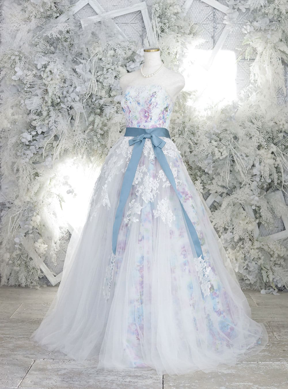 ブルーやパープルの花柄デザインに、ホワイトレースと柔らかいチュールを重ねたプリンセルラインのドレス。 濃い色のサテンリボンでウエストを強調できるため、スタイルアップできます。 寒色系の花柄で甘くなりすぎないデザインになっているため、甘めが苦手な方でもチャレンジしやすいデザインです。白や寒色系の爽やかなタキシードと相性が良いドレスです。