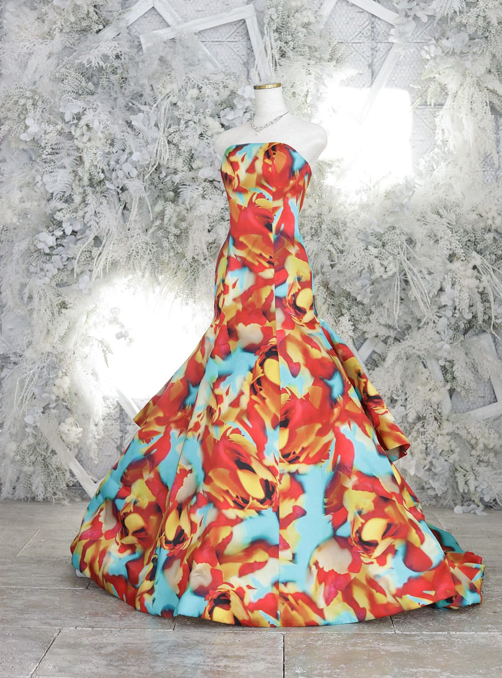 蜷川実花デザインのドレス。黄色や赤・水色などのはっきりとした色使いの大きな花柄が特徴的な、他とは被らないデザイン。 通常のマーメイドドレスより裾が大きく広がっているのもポイントの1つ。バックスタイルも大きなプリーツで豪華なイメージを与えます。あえてシンプルな背景での撮影をすることで、よりドレスを際立だせるのでおすすめ!