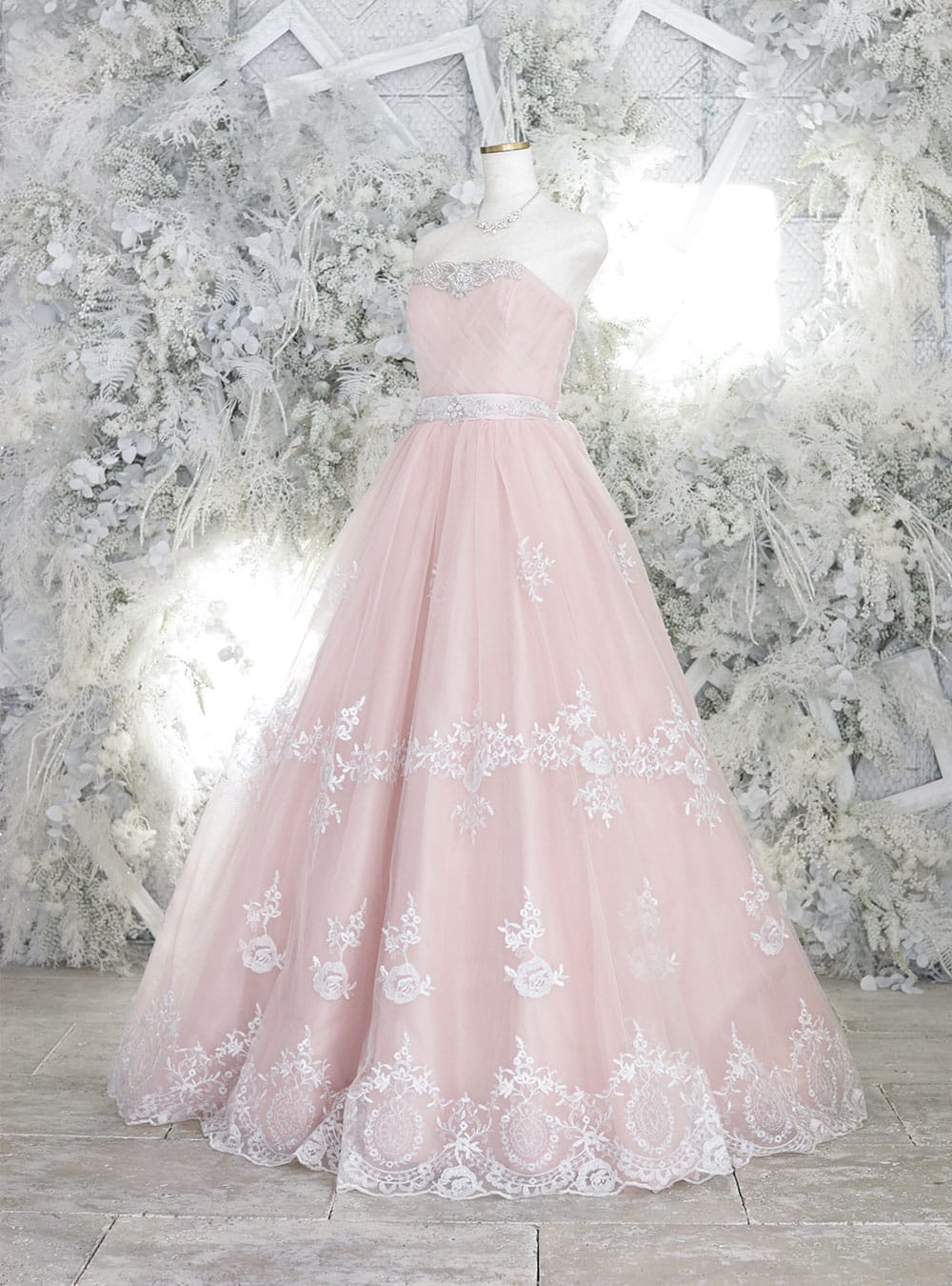 やわらかいピンクの王道プリンセスラインドレス。ウエストにある白のベルトやレース刺繍でより優しく女性らしい雰囲気に仕上がります。 胸元にはベルト同様白のビジューがハートカットのように装飾されているのも特徴的。白や薄めグレーのタキシードと並んで撮影することで可愛くやわらかな世界観が生まれるのでおすすめ。