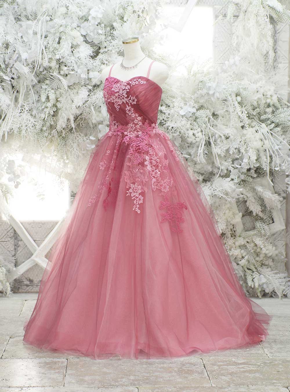 数種類のピンクがあしらわれたドレス。ラメ入りのチュールが何層にも重なり、体の動きに合わせて輝きを放ちます。 大ぶりのフラワー刺繍と細めなストラップがデコルテを華奢に見せてくれるのも嬉しいポイント。胸元はハートカットデザインで可愛らしさを演出。ふんわりとしたダウンスタイルを合わせることでよりフェミニンな印象になりおすすめ。