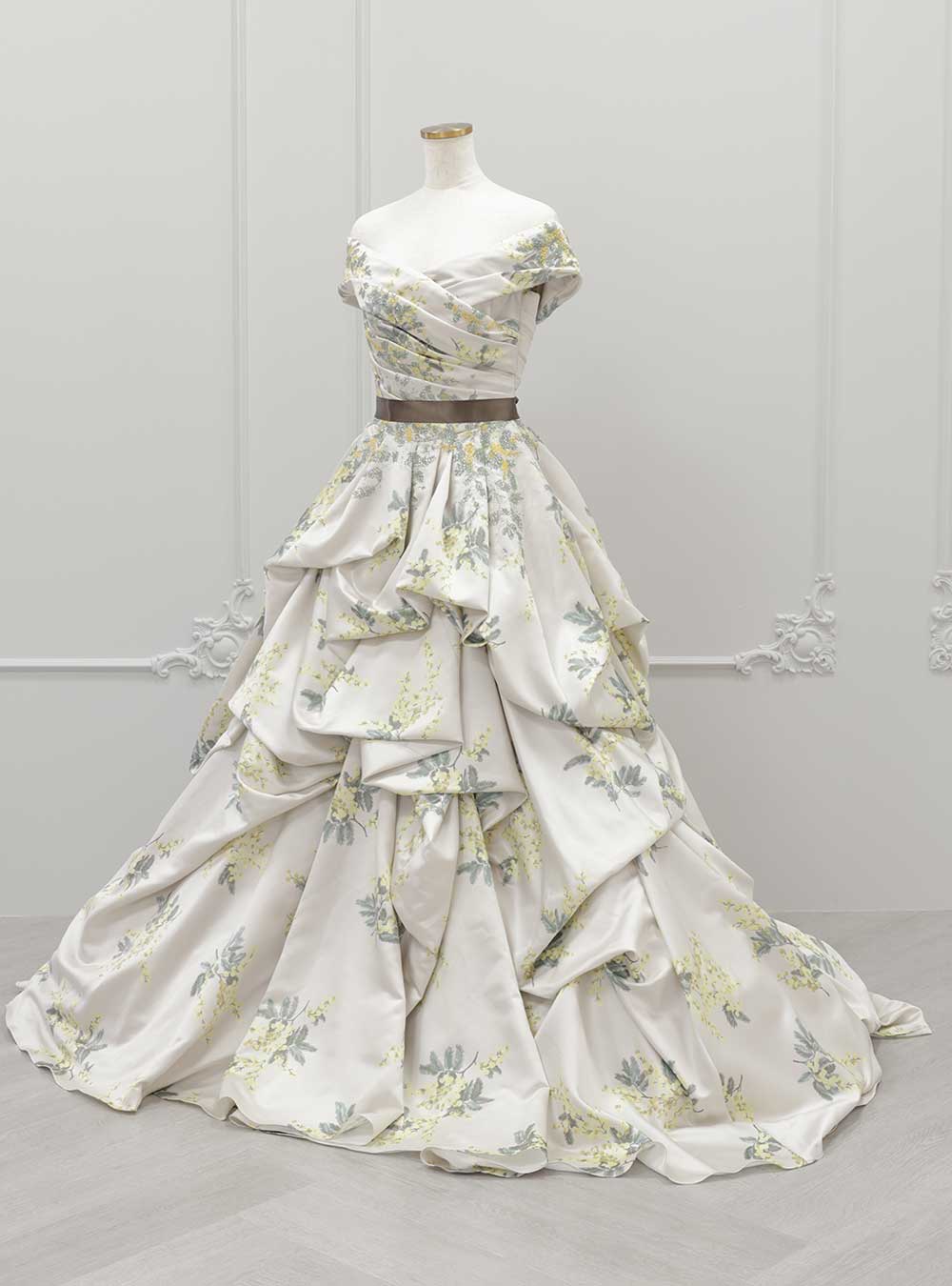 ミモザの全面プリント素材をたっぷりと贅沢に使用し、大胆なタッキングが印象的なサテンドレス。絶妙な色合いで、派手になりがちなボタニカル柄を上品でエレガントな印象にしています。 ドレープから流れるデザインのオフショルダーは、女性らしさがあり気になる二の腕を華奢に見せてくれるので、体系カバーしたい方にもおすすめ。男性衣装にはおそろいのミモザ柄ベストのタキシードがあり、ペアでの着用で統一感のあるオシャレな撮影ができます!