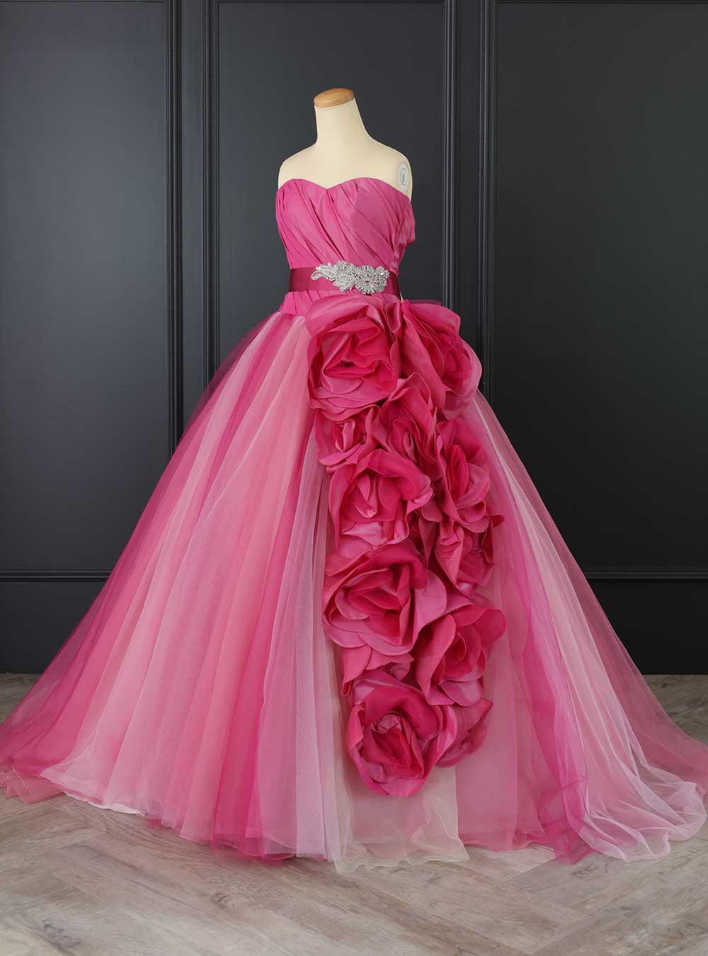 人気のKIYOKO HATAのデザインはシンプルでロマンティックなカラードレス。イタリアンタフタの柔らかいドレープが優美に胸元から流れるチュールドレスは、スカートのグラデーションカラーが繊細な光を捉えて大きなバラの花束を優しく包み込みます。バラの花は取り外してシンプルに着ることもできます。