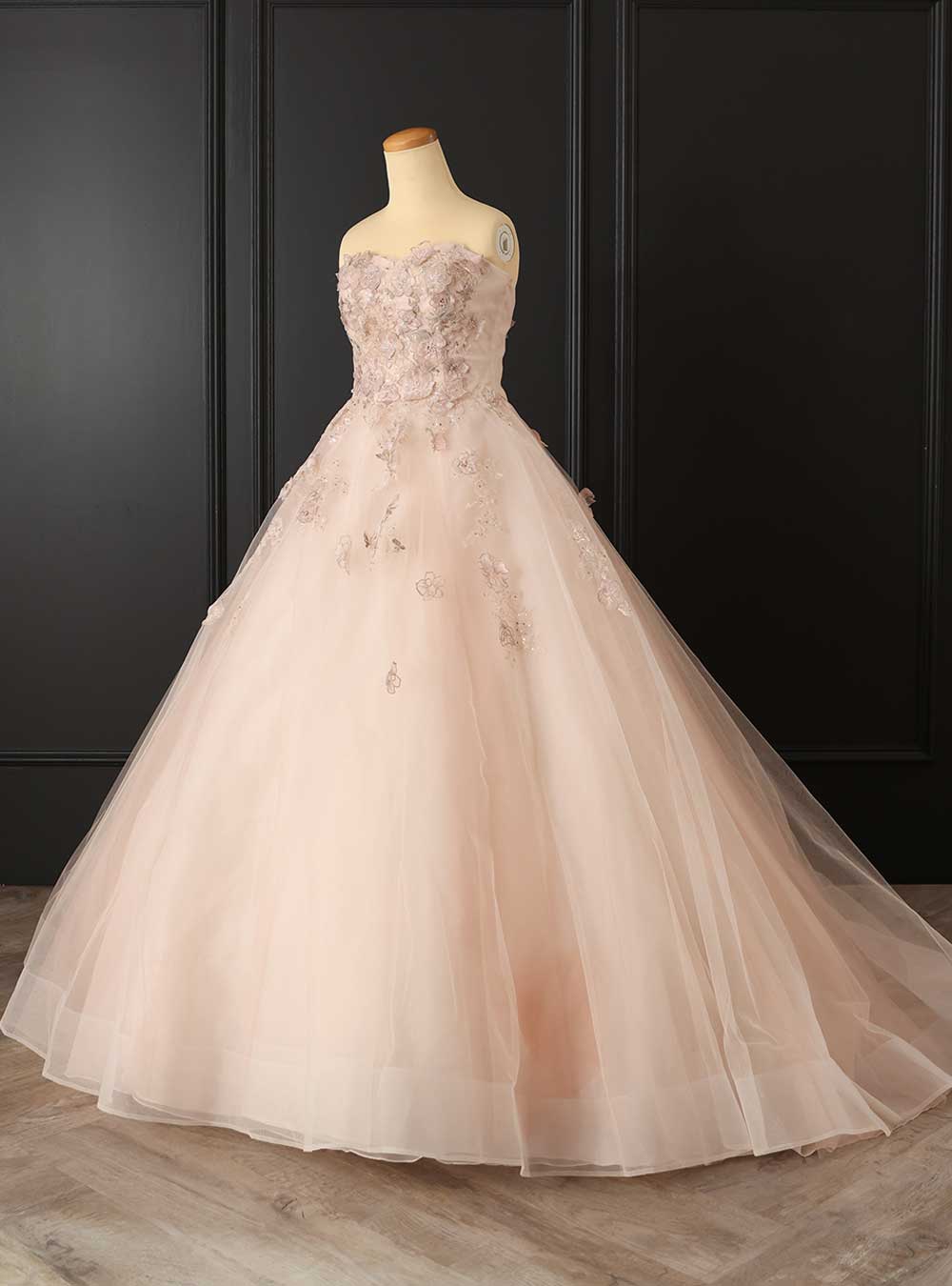 繊細な小花レースをあしらったAラインのドレス。ラインストーンが歩くたびに煌びやかに光を放ち、トップスの繊細で華やかなビジューが可憐な上品さを引き出します。胸元にはシースルーのヨークがあり、取り外しができるのでニュアンスを変えての雰囲気も楽しめます。
