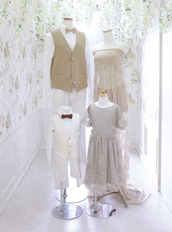 ベージュブラウン系で統一されたファミリーマタニティ衣装。 ママの繊細なレースが施されたベージュのトレーン仕様のマタニティドレスは、上品で落ち着いた雰囲気を演出。 お子様のグレー調の総レースドレスは、清楚で愛らしい印象を与えます。 柔らかな素材感と落ち着いた色合いが、ナチュラルで統一感の出る衣装です。