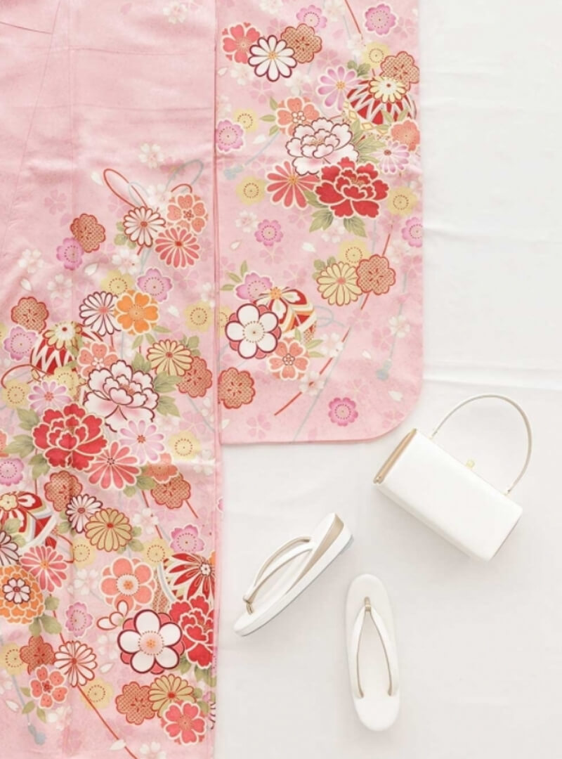 全体的に広がるピンクが印象的で可愛らしい雰囲気が漂う振袖です。梅、桜、菊、牡丹と様々な花が施されており、華やかさも際立つ一着となっています。 また、所々に桜の花びらが散りばめられているので、春のような暖かいふんわりとした印象を演出してくれます。黄緑の葉も差し色となっています。優しく可愛い雰囲気が好きな方におすすめです。