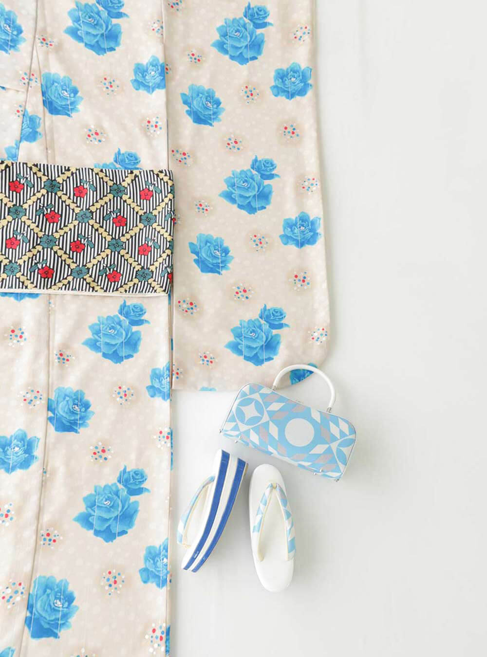 「moden antenna」の人気な振袖で、ブルーローズの花柄が特徴的です。ベージュ地に鮮やかな青いバラが映え、小さなドットが全体にアクセントを加えています。 また、おしゃれな縞模様と赤い花が描かれた帯がモダンな雰囲気を醸し出し、全体のコーディネートに個性をプラスします。この振袖は、伝統的な美しさと現代的なデザインを見事に融合させた一着で、特別な日の装いをより一層華やかに演出してくれます。
