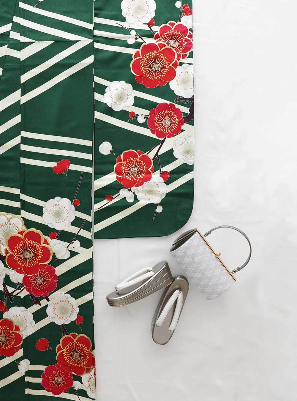 人気の深い緑色で全身統一されており、大人っぽいのモダンな振袖です。また、紅白の大きな梅の花が華やかさをプラスしてくれます。 梅の着物柄には忍耐力や美の意味があり、晴れの日にぴったりな柄です。タイトなヘアスタイルにすると更にモダンな雰囲気が増して大人っぽい雰囲気にしたい方におすすめの一着です。
