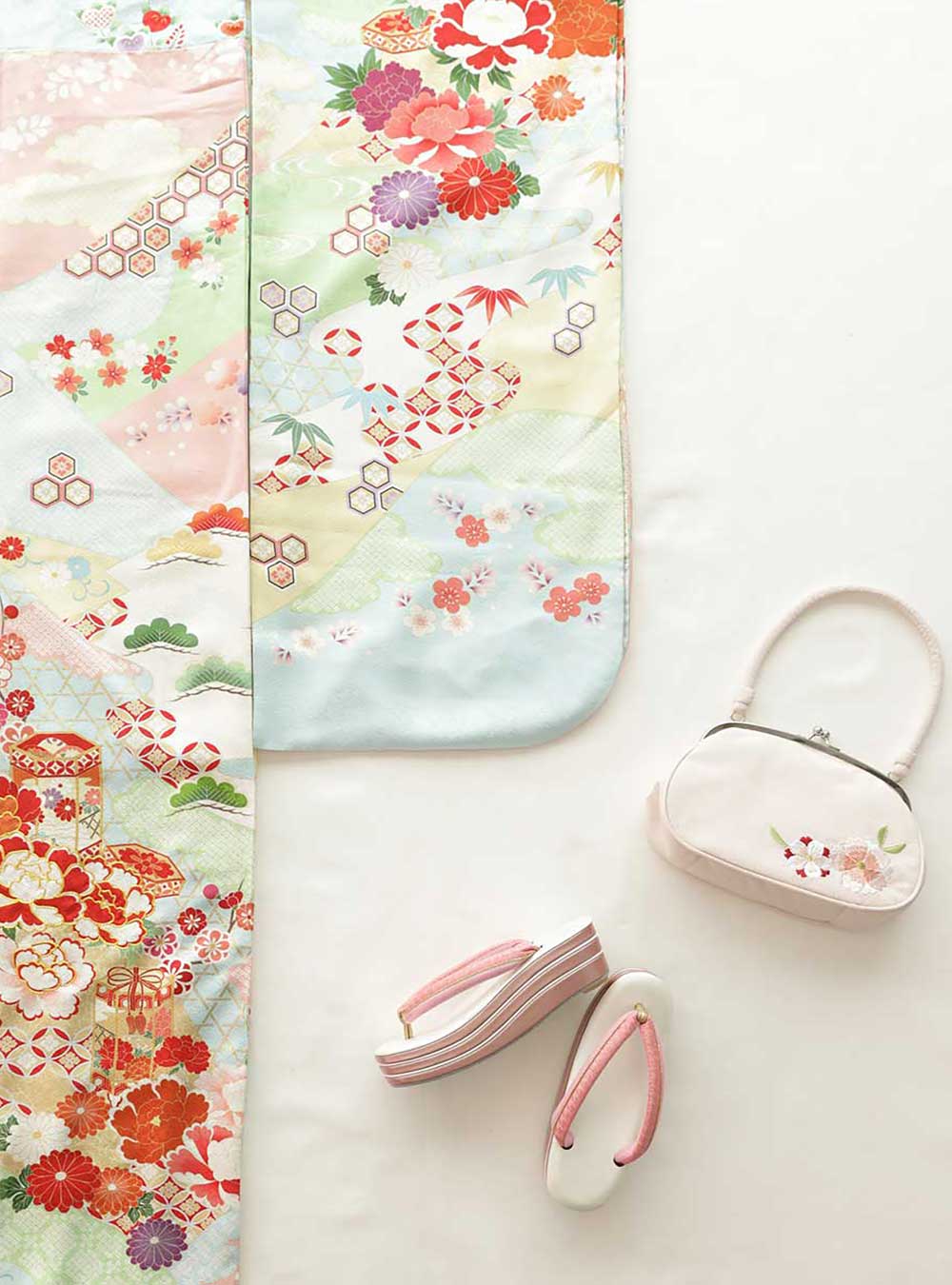 柔和な色彩と華やかな美しいデザインの振袖。淡いパステルカラーの地に、色とりどりの花模様や伝統的な文様が優雅に配置されています。特に、四季折々の花々が描かれており、季節を問わず、どの場面でも華やかさと品格を演出します。 淡い色合いが繊細かつ上品な印象を与え、着る人の美しさを一層引き立てます。優美でありながらどこか可憐な雰囲気を漂わせます。