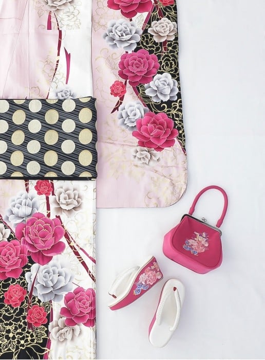 モダンで洗練されたデザインの振袖。優雅なピンク色と大胆な黒色を基調とし、豪華なバラの花柄が印象的に描かれています。ピンクと黒のコントラストが華やかでありながらもシックな印象を与えます。大輪のバラが鮮やかなピンク色で描かれており、白やゴールドのアクセントが上品さを加えています。 さらに、黒地に金色のバラ模様が施されており、モダンな雰囲気を醸し出しています。