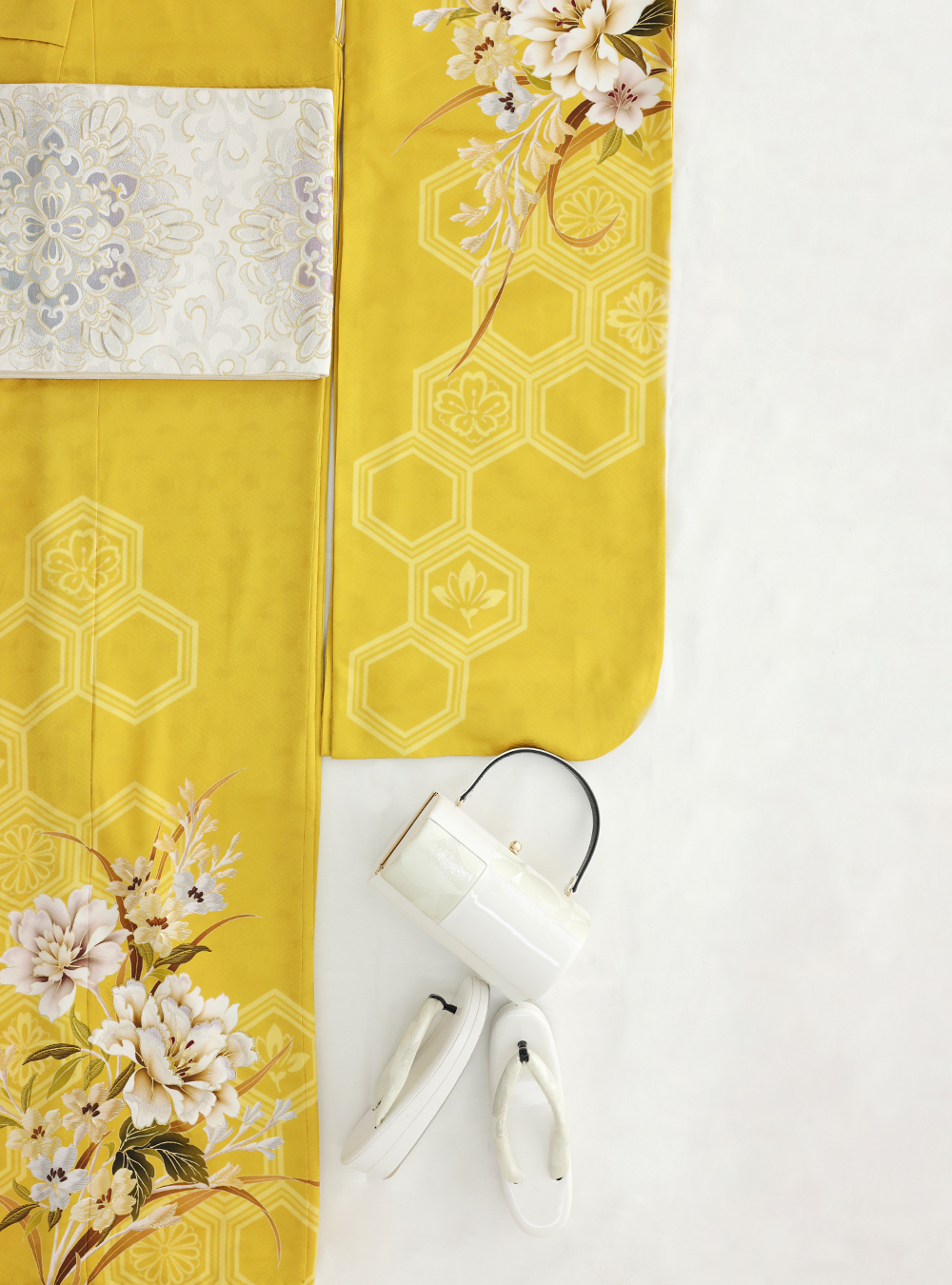 ブランド妓都の振袖です。上品なからし色をメインに使用したシンプルで洗練されたデザイン。ポイントに牡丹や亀甲文様の柄があしらわれており女性らしく大人っぽい印象を与えます。セットの帯には牡丹の色味に合わせた白を合わせシンプルにまとめたコーディネート。帯回りにはブラウンやえんじ色などの濃い色味の小物を合わせればクールなコーディネートにもアレンジして頂けます。