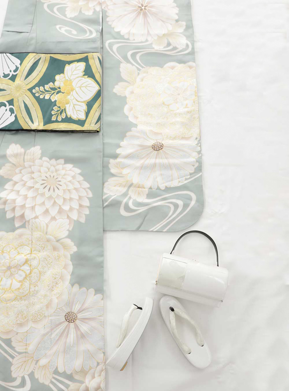 トレンドの淡い色味の振袖の中でも特に人気のミントグリーンです。淡いベージュで大きな柄が描かれており上品で落ち着いた印象です。セットの帯で差し色のグリーンを入れることで全体が引き締まります。 帯周りには柄に合わせた淡いトーンの小物をあわせればトレンド感のあるコーディネートに。レースやパール、フリルなど洋風な小物もおすすめ。