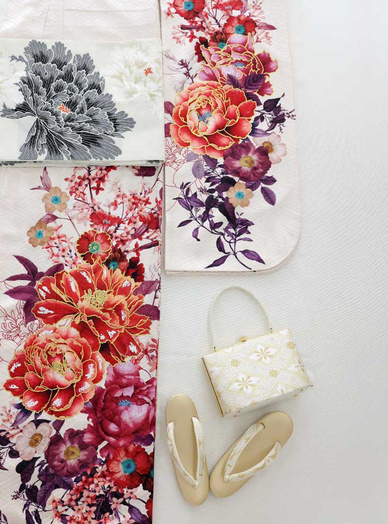 やわらかな生成り地に、大輪の牡丹を中心とした赤や紫、青などの華やかな花々が描かれた振袖です。繊細な色使いと立体感のある構図が印象的で、凛とした美しさを引き立てます。個性を大切にしたい方にぴったりの、洗練された一着です。