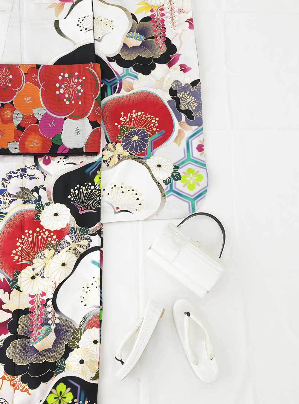今田美桜がモデルの振袖です。ホワイト&ブラックがメインカラーなのでかっこいい印象です。梅柄の赤がポイントカラーになっており、セットの帯や小物の柄のアクセントとなっております。 振袖の左右で色味が違うので見る角度によって雰囲気が変わるのも特徴です。レトロモダンが好きな方におすすめの1着。