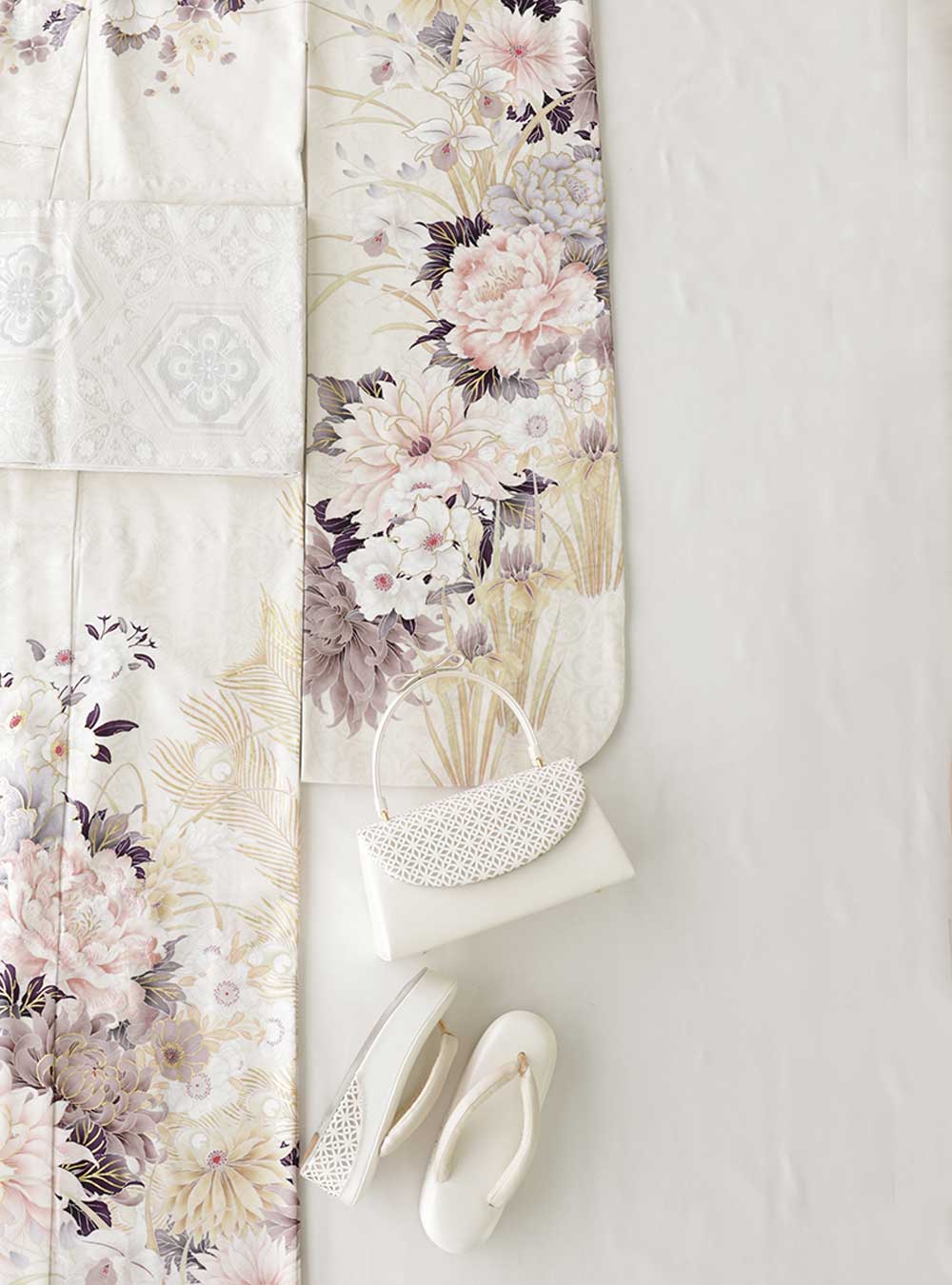 白地に淡い色彩で描かれたくすみカラーの柄が大人の上品さを演出。透明感のある大人可愛いデザインで近年人気の振袖です。 帯はシンプルなホワイト×シルバーデザインで流行の同系色コーディネートがおすすめ。明るいハイトーンカラーにも黒髪にもコーディネートの似合わせができます。