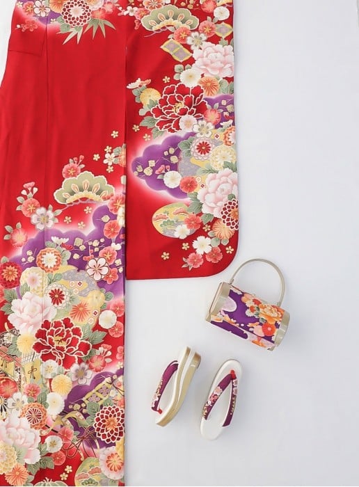 鮮やかな赤を基調とし、豪華な花模様や紫、白、黄緑などの色彩が調和した振袖です。紫のぼかしが花々を一層引き立てるとともに、立体感と深みを与えています。 竹や松などの伝統的な和柄がアクセントとして加えられ、季節感と高貴な雰囲気が漂っています。吉祥文様である松竹梅は晴れ着である振袖の柄にふさわしく、成人式にもぴったりの柄です。
