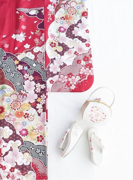 鮮やかな赤地に豊かな花模様があしらわれたこの振袖は、エネルギッシュで大胆な印象を与えます。黒と白の波模様がアクセントとなりモダンさと伝統美を絶妙に融合。 そして絞り模様の黒が更に高級感を演出。「黒」は格式の高い高級な色とされており、この色が入ることによって多彩な花々が、より一層華やかさを発揮し特別な日の装いをより一層引き立てます。