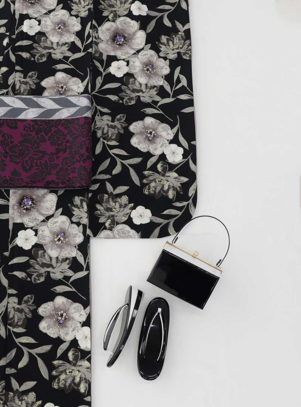 人気ブランド「玉城ティナ×紅一点」の振袖。グレーと黒地のアシンメトリーなデザインは周りと被りにくいのも魅力の一つです。 くすみカラーにモダンな花柄を合わせた振袖はシックな印象になります。帯はグレーと紫のツートーンカラーになっており大人かわいいコーディネートをしたい方におすすめの振袖です。