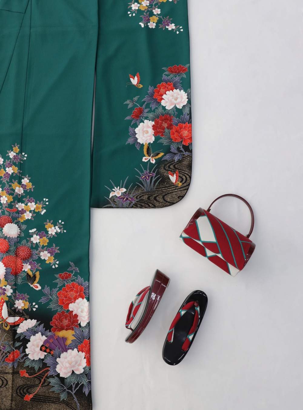 新緑を基調とした、シンプルで大人っぽい振袖です。 裾に描かれた大輪の牡丹は、気品と華やかさを添えてくれます。散りばめられた小花や金色の流水模様が、上品な雰囲気を演出。シンプルで上品な振袖だからこそ映える花模様や大きな牡丹がクールで落ち着いた印象にしてくれます。昔ながらの古典的な一着です。