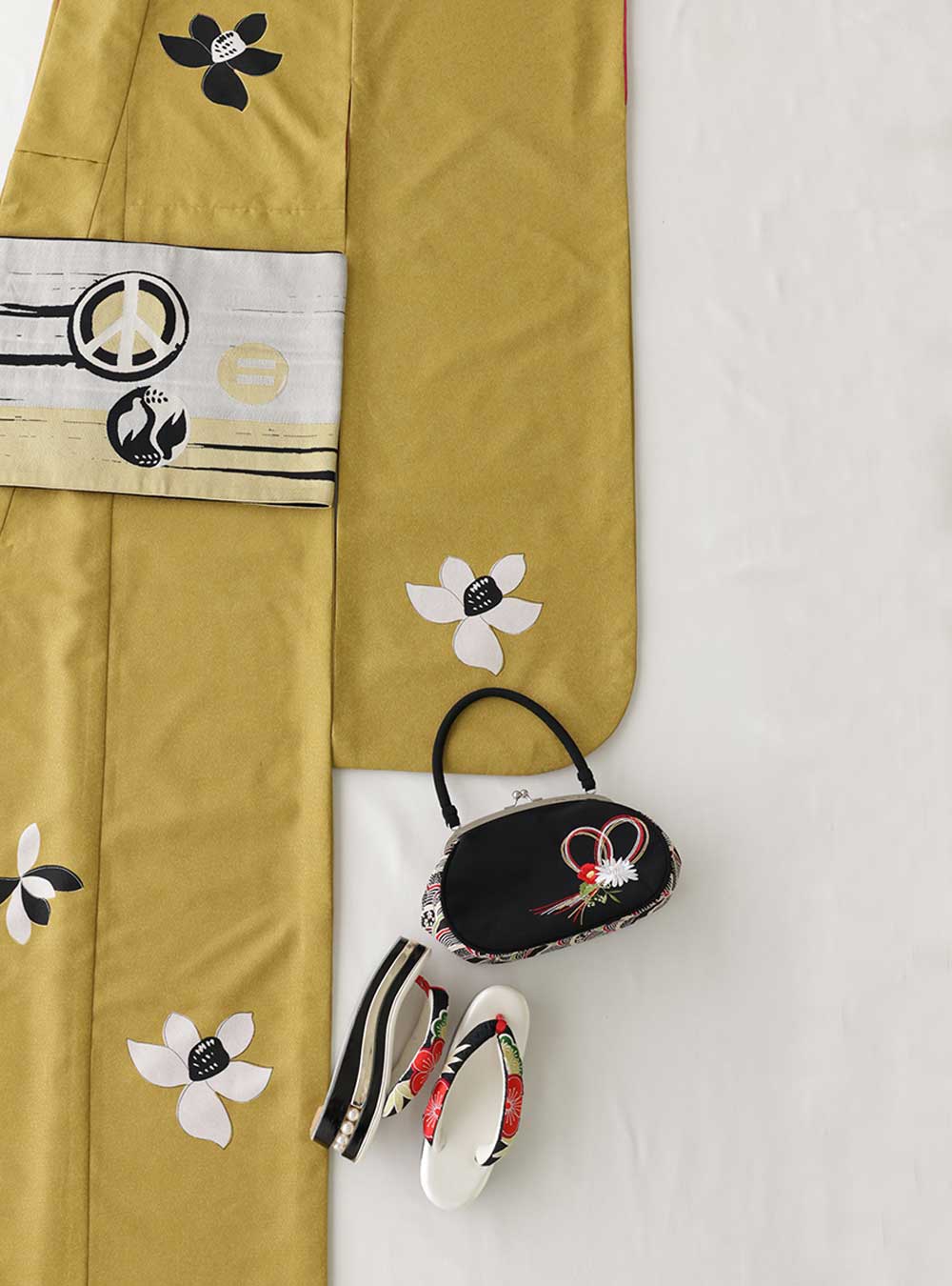 オリーブイエローの生地にはキラキラと輝くラメが織り込まれており光沢のあるデザインになっています。 ワンポイントの花柄がmoden antennaらしい個性的な雰囲気のヴィンテージ振袖。ファッション性の高い個性あふれるデザインです。
