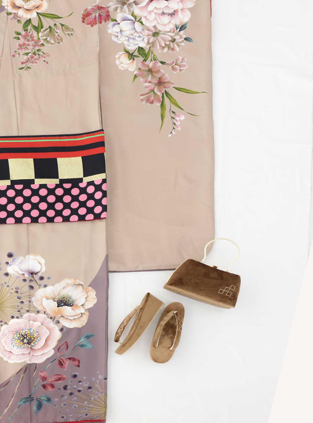 ブランド「mogafuri」の振袖。上品なベージュに大きな花柄が華やかに描かれており、その繊細な刺繍と色彩の調和が目を引きます。 帯には鮮やかな赤と黒の市松模様が施されており、全体の印象を引き締めています。この振袖をまとうことで、日本の伝統美を身近に感じながらも、現代的なスタイルを楽しむことができます。