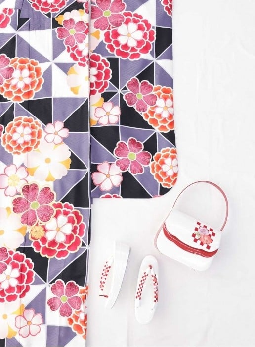 大きな花と大正ロマンを思わせる幾何学柄が織りなすレトロモダンな振袖。鮮やかな花々があしらわれ、すっきりとしたレトロモダンなデザインが特徴。袖や裾に広がる花模様が動くたびに優雅な印象を演出します。 グレー・ブラック・ホワイトのモノトーンカラーに、アクセントカラーの華やかな花模様が個性派さんにもウケの良いデザインと言ってもいいでしょう。