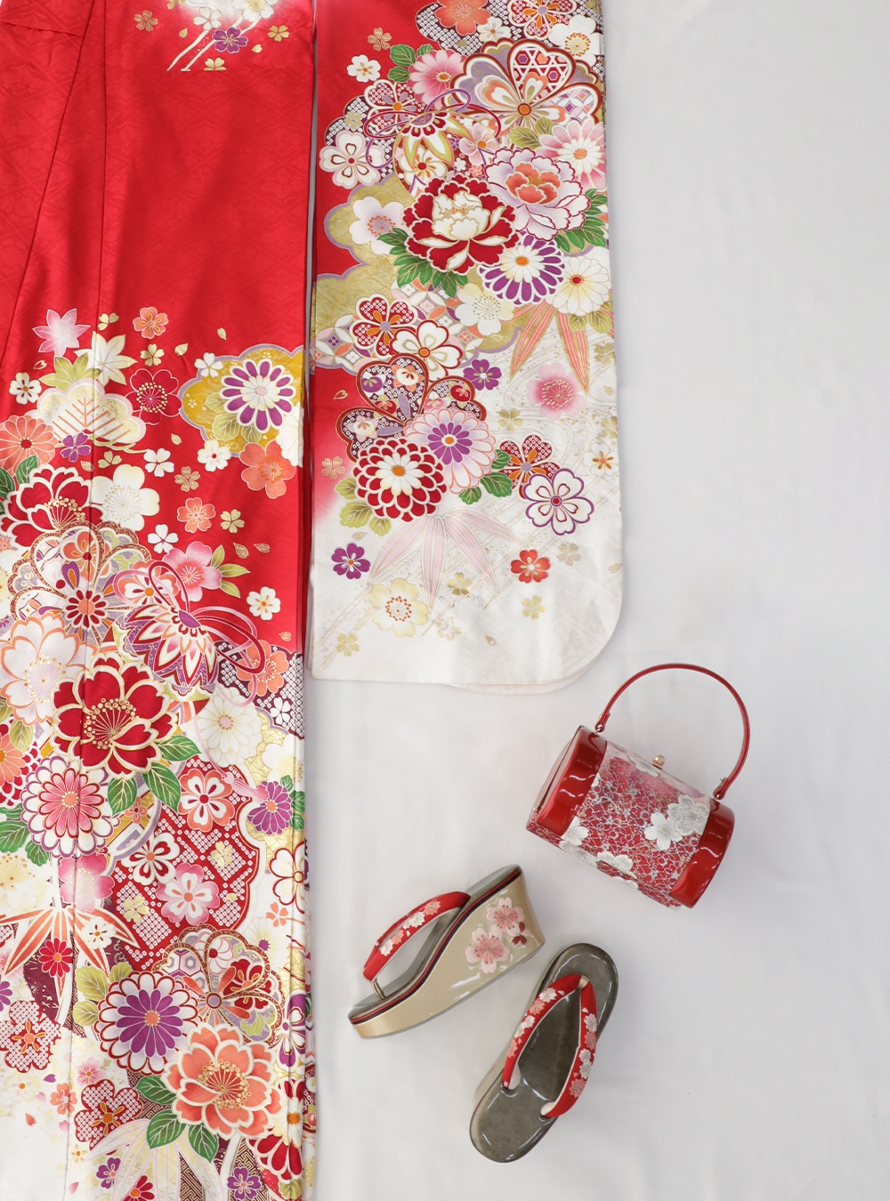 赤色と白色のグラデーションになっている振袖です。ピンク、紫、黄色、緑といった色とりどりのカラーが使用され、華やかな印象に。 古典柄の菊や、梅、桜、牡丹が散りばめられ、さらに豪華さを加えています。どの世代からも愛される昔ながらの古典的な着物で、上品で王道の振袖を着たい方におすすめの一着です。