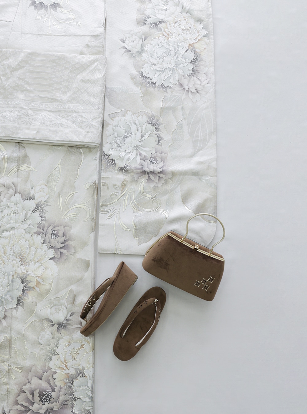 「ちょっとレトロ、そしてモダンで可愛い」がテーマのブランドのラフィネの振袖です。オフホワイトを基調とした淡いベージュやグレーの色使いが上品で統一感のあるふわふわした雰囲気のデザインになっています。 エミュオリジナルコーディネートのフルセットになっており、現代的で大人可愛い印象になる振袖です。