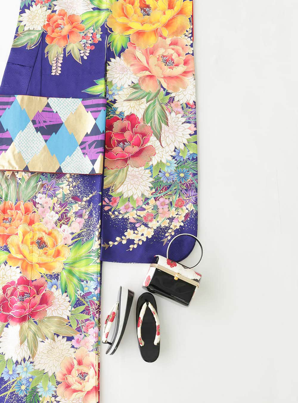 基調となる紫色と、大輪の牡丹の花のコントラストが印象的。パープルとイエローの対照的な色遣い、写実的に描かれた豪華な花々、それらをまとめるのはモダンで個性的な帯。まるでアートのような美しさを演出します。牡丹の花は「富貴」や「幸せ」といった意味があります。目を引く華やかさと縁起のよさ。 はたちの門出に是非チャレンジして頂きたい着物です。