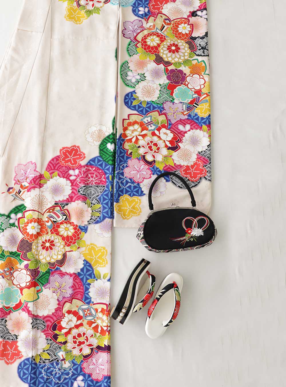 オフホワイトをベースに、ピンクや赤、青、緑、黄色、紫といった色とりどりの色彩が華やかな振袖です。 古典柄の菊や牡丹、梅などの花々が着物全体にバランスよく配置され、可憐で華やかな印象を与えます。伝統的な柄と現代的な色使いが調和し、流行を取り入れた新古典ならではのデザインです。