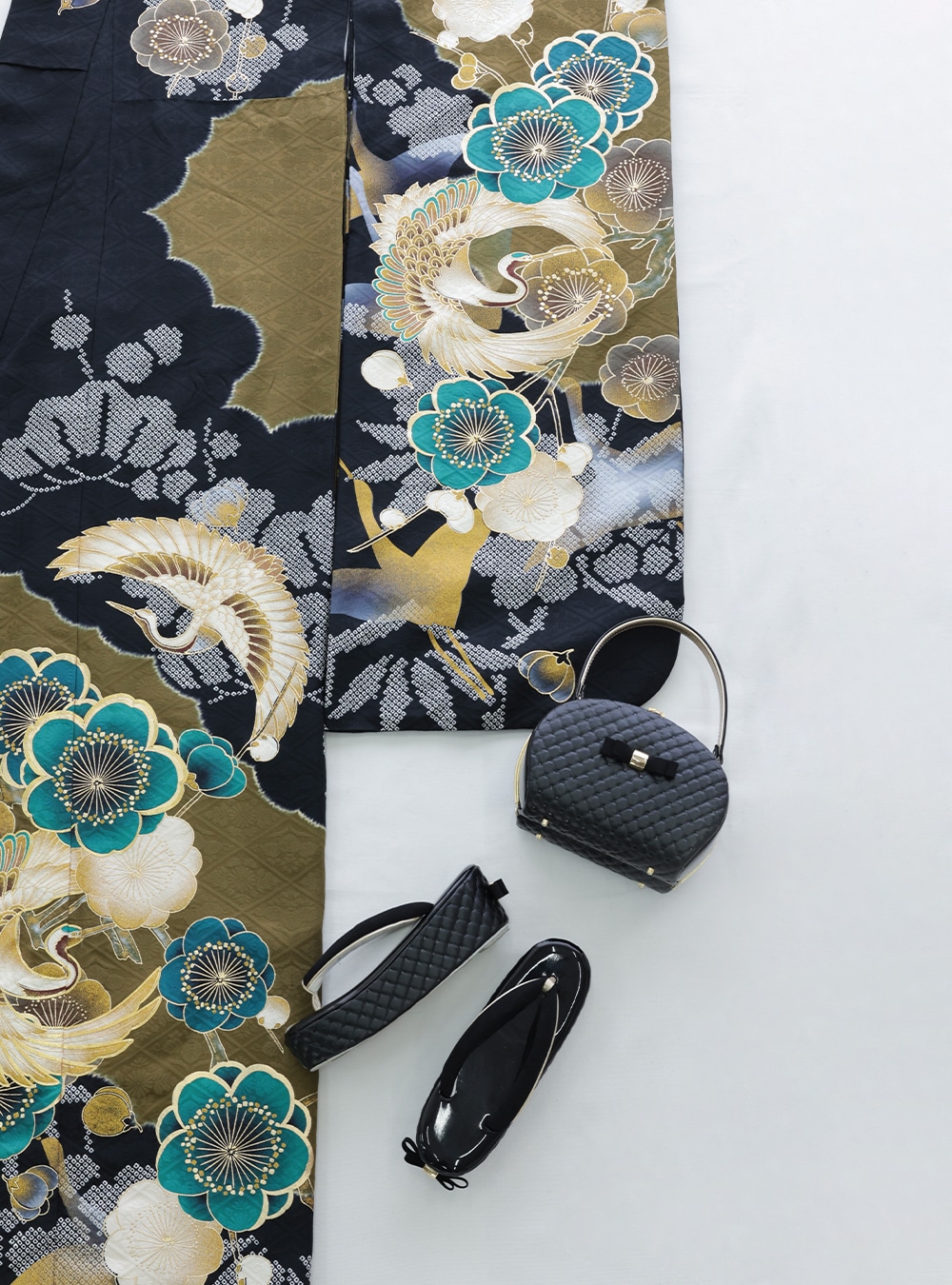 黒地をベースにゴールドの鶴とカーキの鮮やかな差し色が目を引く振袖です。落ち着いたトーンで大人っぽいモードな印象に、現代的な柄と昔ながらの古典的な柄を取り入れ、モダンな雰囲気にもなり、散りばめられた柄の中にゴールドのラメが華やかな雰囲気が振袖ならではの豪華さを演出してくれます。