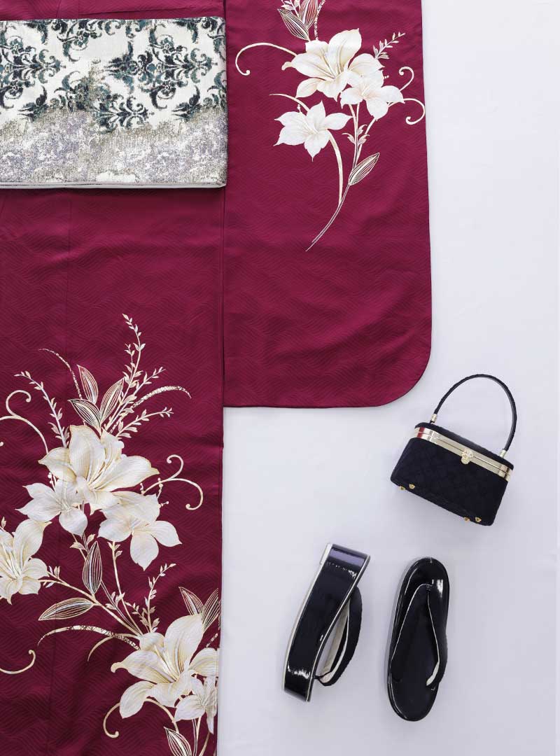 深みのあるボルドーを基調に、流れるように描かれた百合の花が印象的な振袖です。上品な生成りと金彩で表現された花文様が落ち着いた色味の中に華やかさと女性らしさを添えます。すっきりとした地色に柄を抑えて配することで、洗練された大人の雰囲気を演出。凛とした存在感と気品を兼ね備え、特別な一日をドラマティックに彩ってくれる一着です。