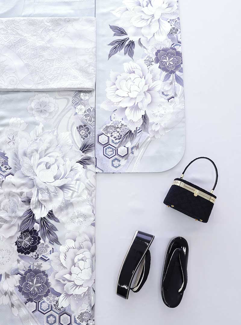 淡い水色を基調に繊細に描かれた大輪の花々が印象的な一着。モノトーンで統一された配色が甘さを抑え、洗練された大人の雰囲気を演出します。立体感のある柄行きと奥行きのある陰影が写真映えはもちろん、凛とした存在感を引き立てます。シルバーや白系の帯でまとめればクールに、差し色を加えれば個性が際立つ、幅広いコーディネートが楽しめる振袖です。