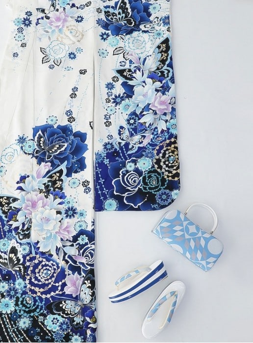 近年人気度を上げている白地の振袖に、鮮やかな青や水色のバラが映える、とても爽やかなイメージの1着。青いバラは『奇跡』や『夢が叶う』の花言葉を持ち、一緒に描かれている天高く舞う蝶ともバランスよく、豪華なデザインです。 落ち着いた雰囲気を出す白や青色はクールな印象+洋柄と相まってよりゴージャスな印象に。