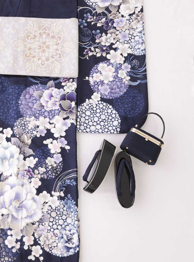 深みのあるネイビー地に牡丹や桜、小花が上品に描かれた振袖。華やかさを象徴する牡丹と、可憐な桜の組み合わせが、大人っぽさの中にやさしい華やぎを添えます。落ち着いた色味で、可愛くなりすぎず、上品で洗練された印象の一着です。