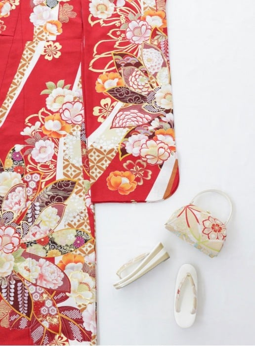 人気な赤色の振袖は、どの世代からもいつまでも人気のある色味です。赤地に大きな花模様がデザインされ同じ赤地でも目を引く色味となっています。花びらの中にも様々な花や模様が描かれており、インパクトのある1着です。 ゴールドの帯や草履・バックと合わせる事でより華やかな印象になります! 和室や傘などの和風小物との相性ばっちりなのでオススメ。